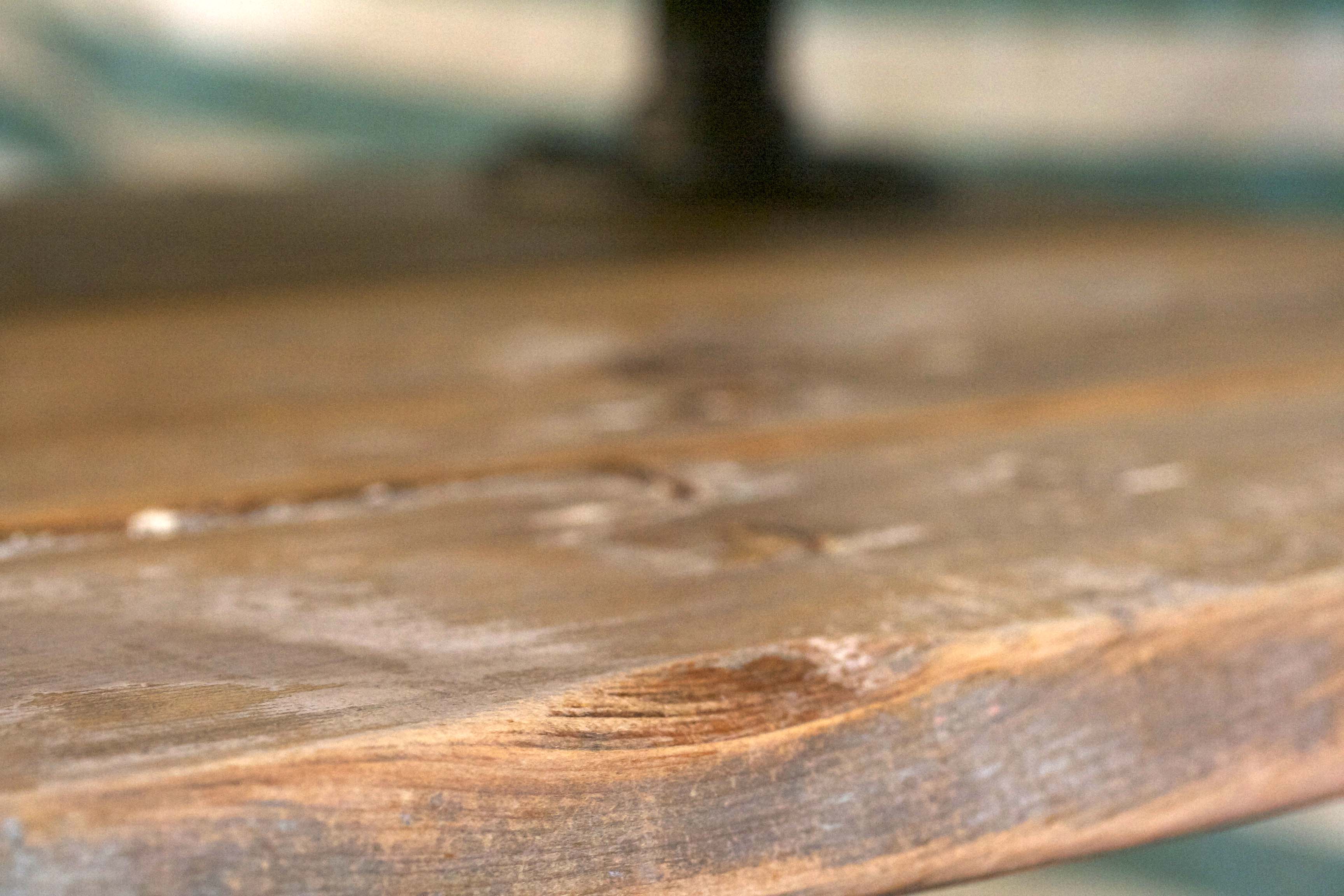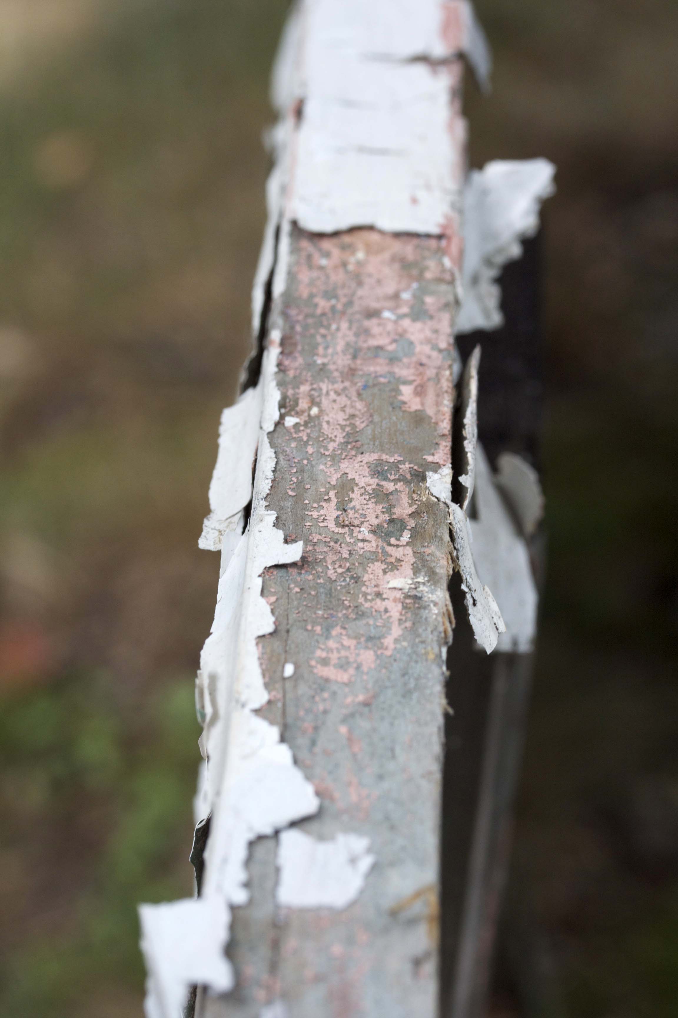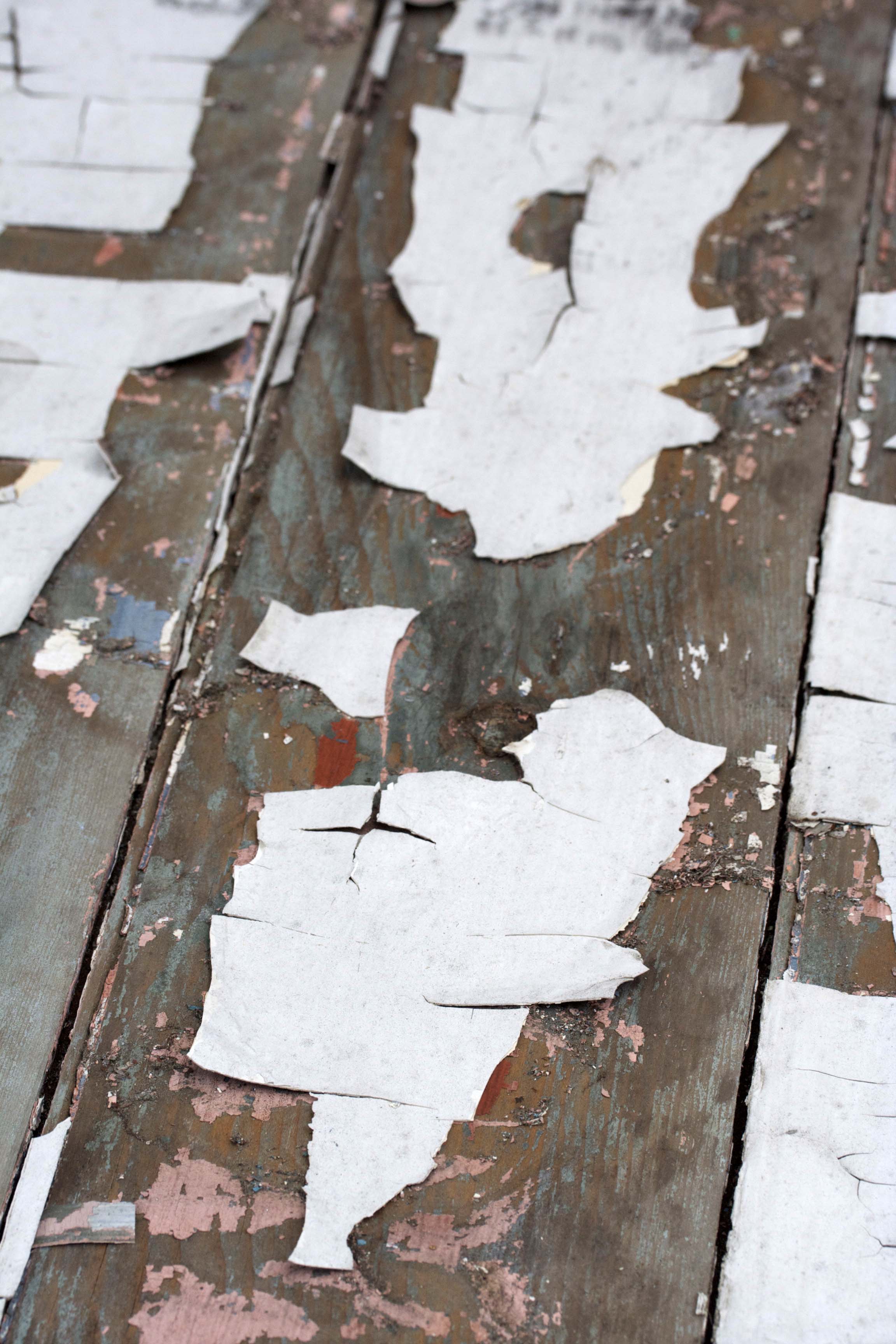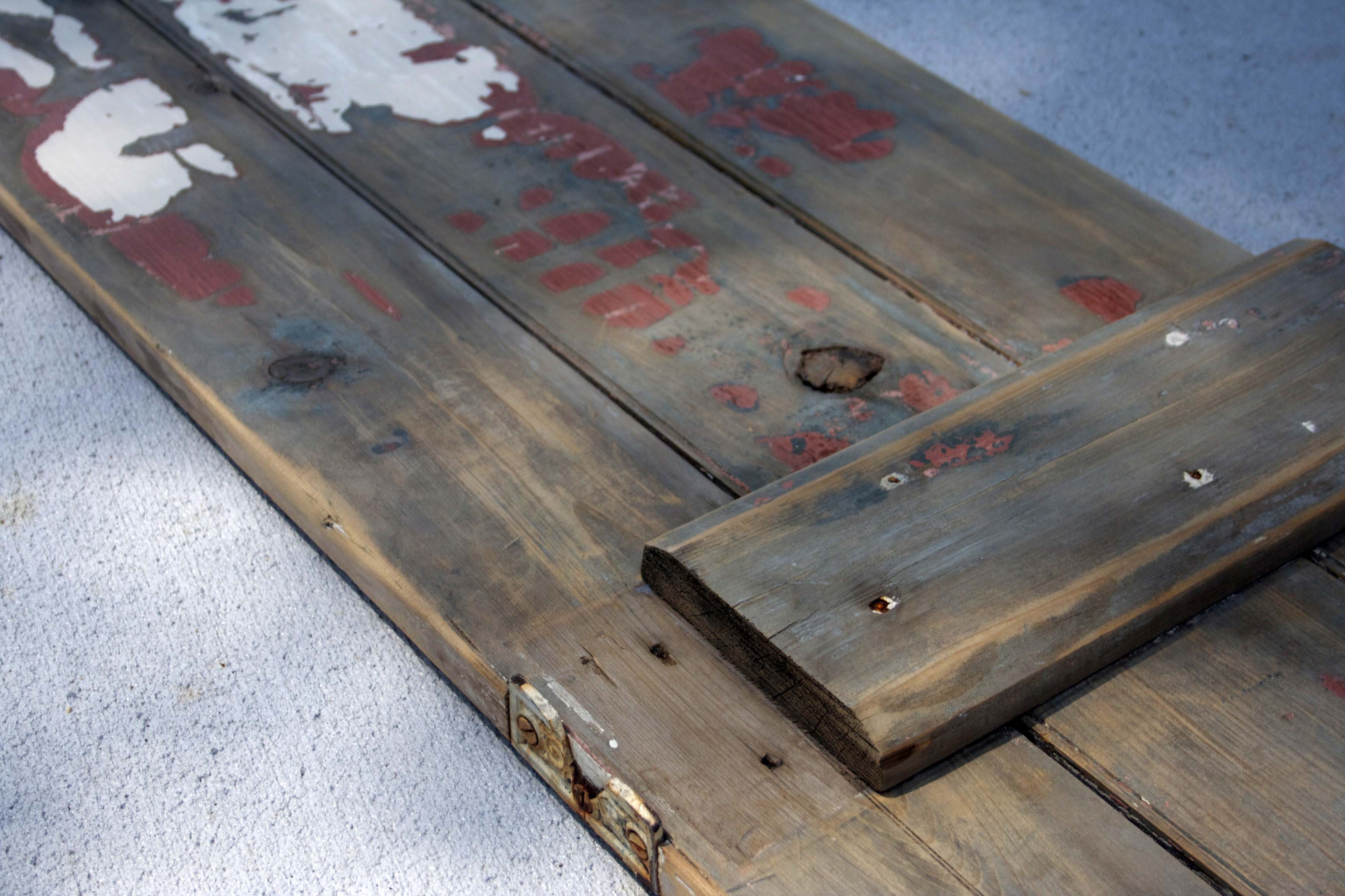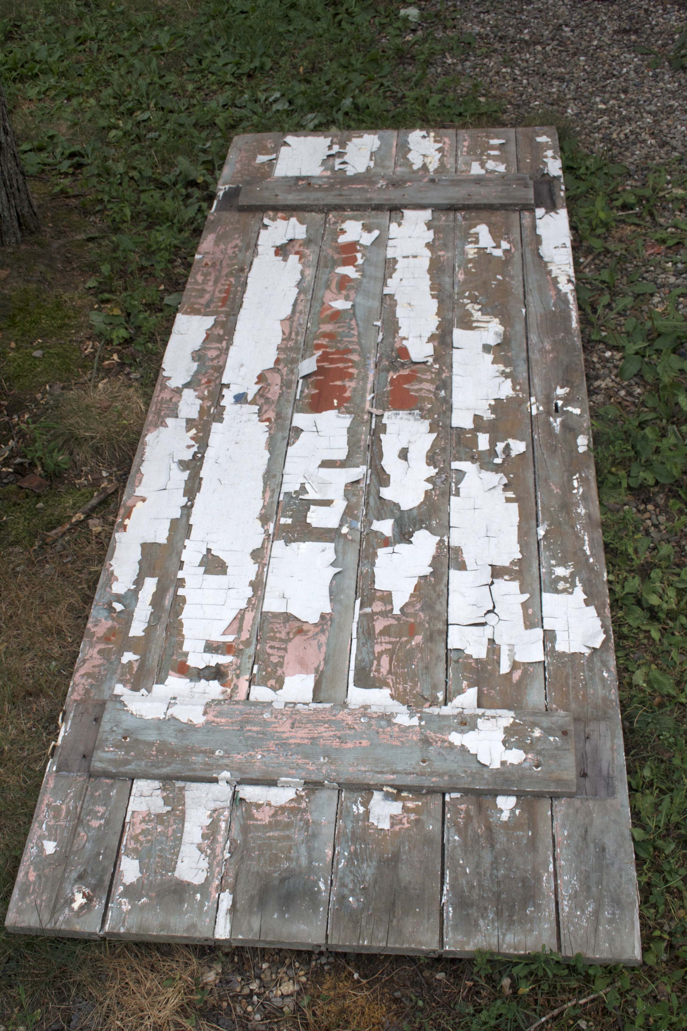 Therefore, I sliced the planks on the back of the door — the ones holding all that jazz together — right in half with a hand saw. The two halves came right apart, and I began peeling off the probably toxic flaking paint. I made sure to leave some, because I’m digging the look of well-used wood nowadays.