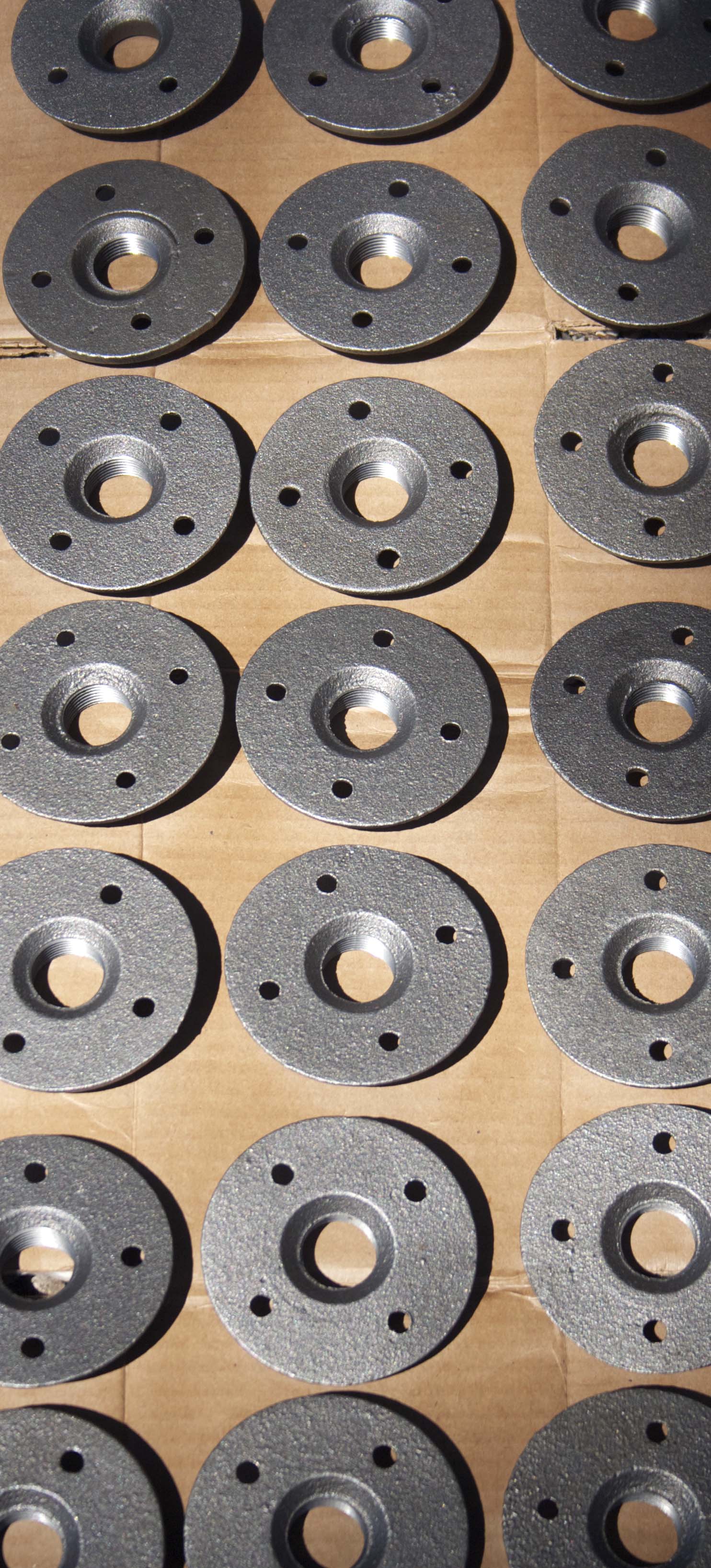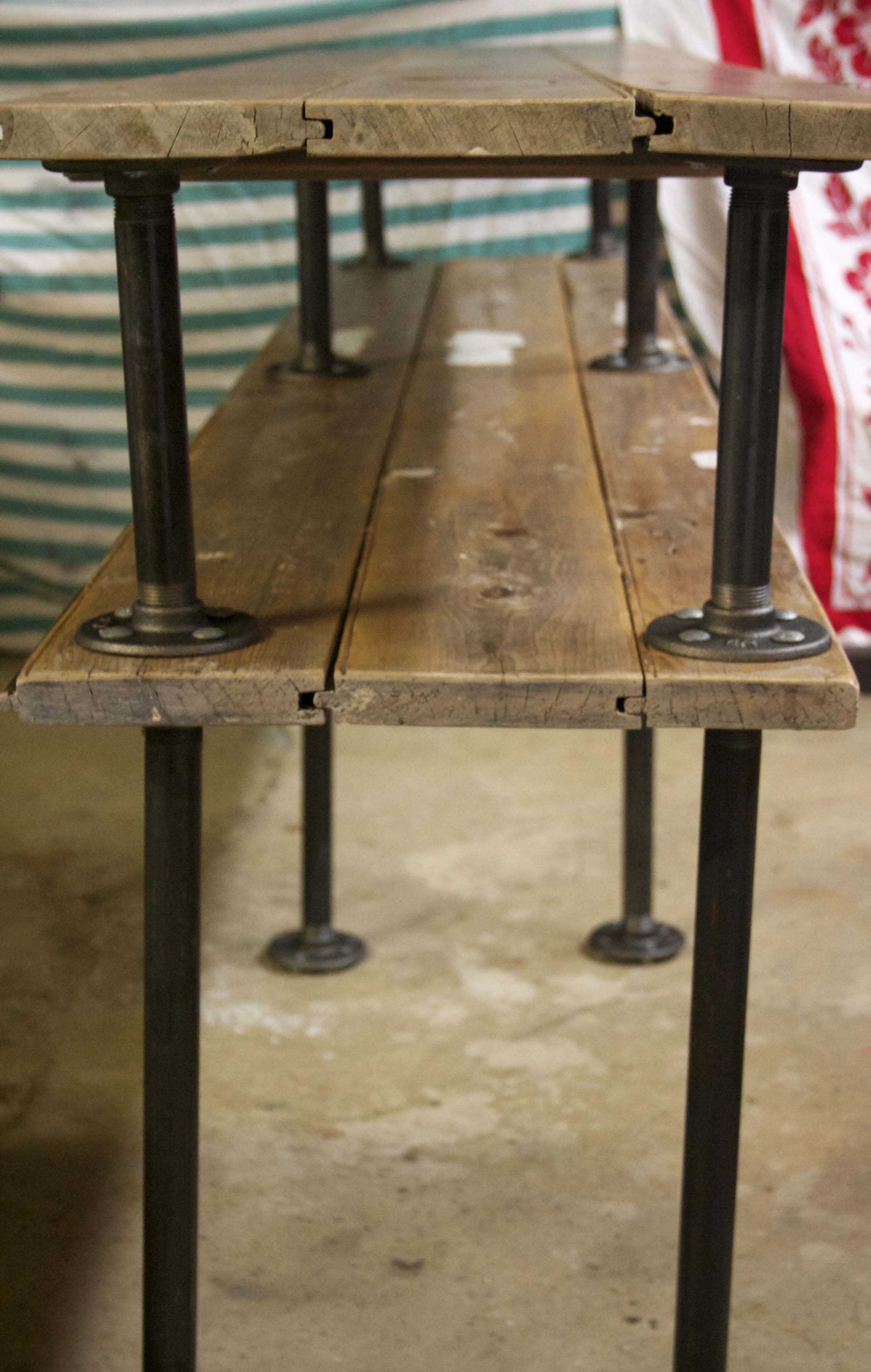 Simple pipes and flanges made up the table legs. The legs closest to the ground are around 18 inches, while the supports between the top of the table and shelf are around 8 inches. I plan to use the space between the shelf and the floor for records.